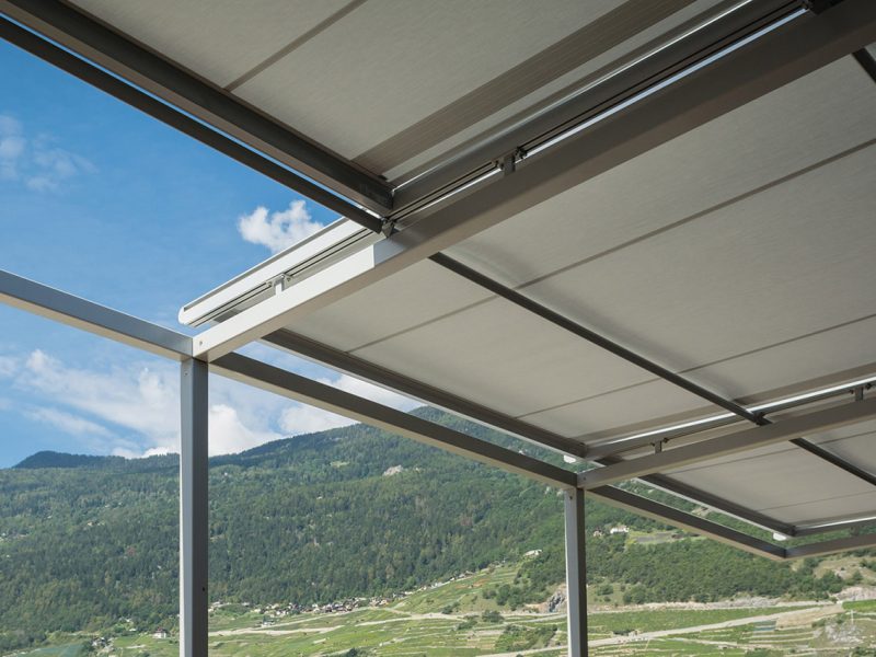 The Rivera awning is a pergola awning with a retractable fabric roof, designed to cover large terraces. Its fabric is guided and tensioned by a lateral rail system, ensuring excellent stability. It provides reliable sun protection and optimal outdoor comfort.